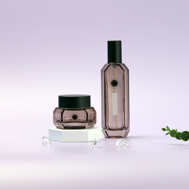 A six-sided glass bottle designed with eco-conscious principles.